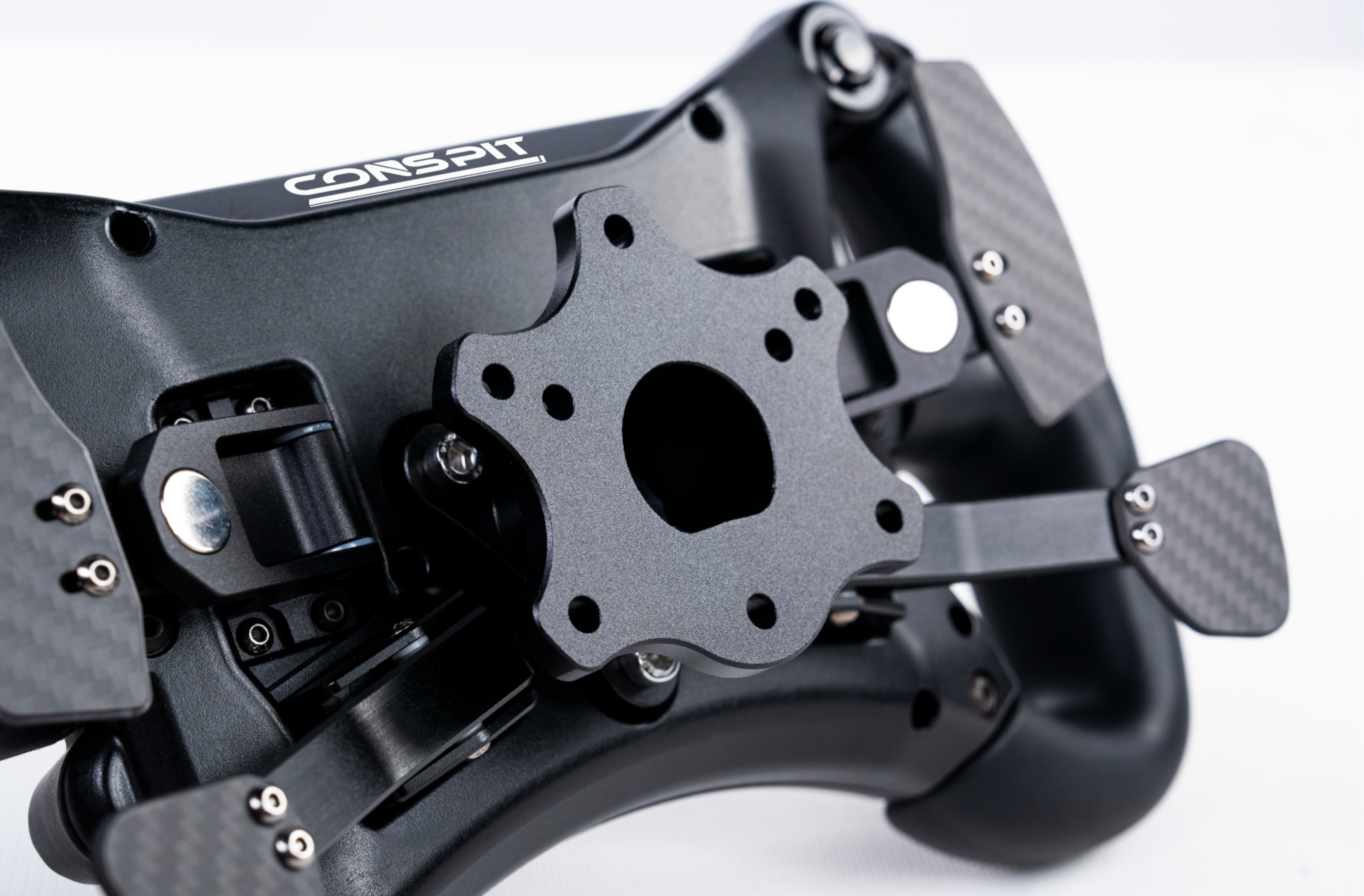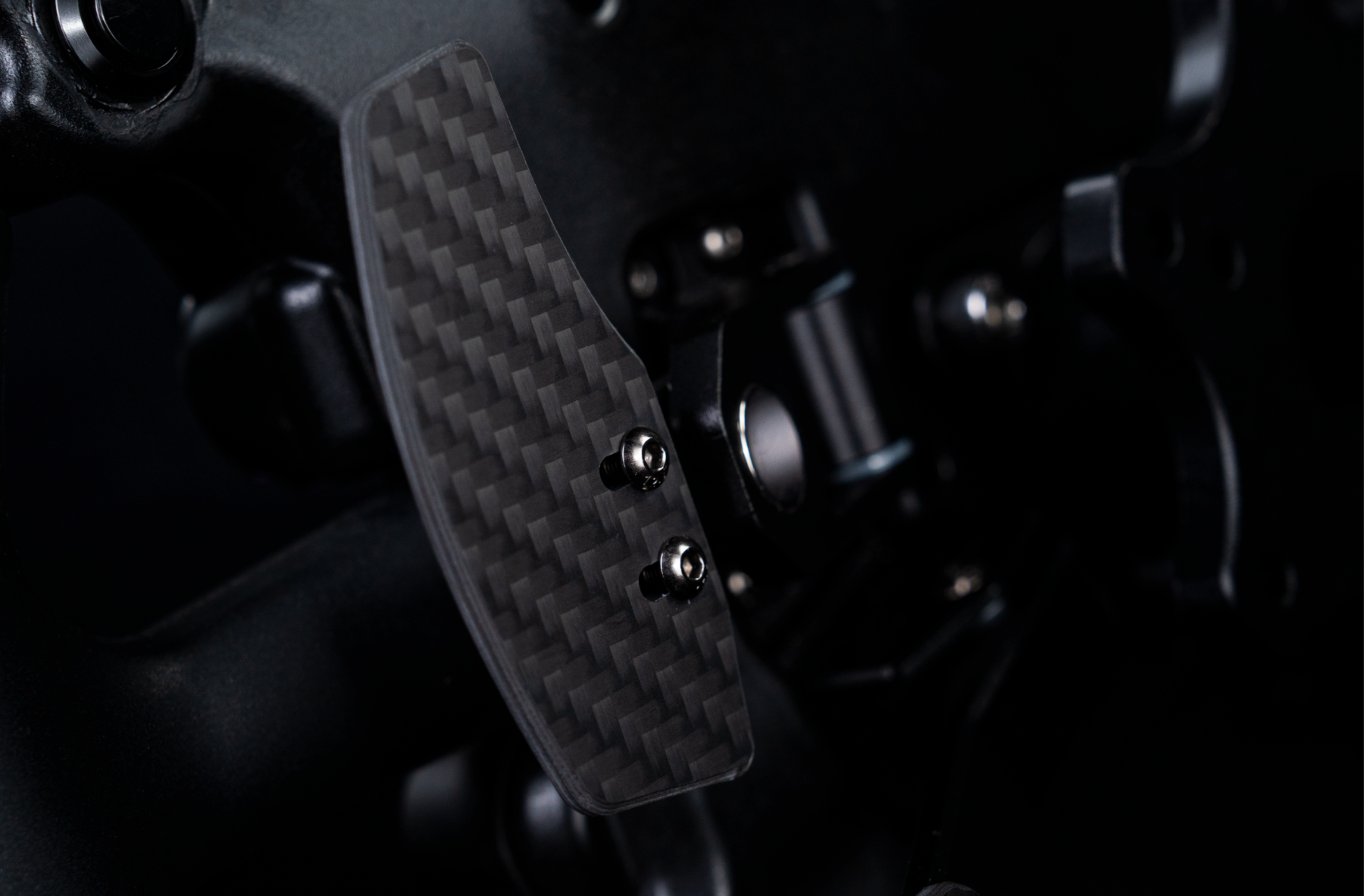 Panel frontal de fibra de carbono real 3D + cuerpo principal de aleación de aluminio de alta resistencia en un diseño de enclavamiento de precisión. La construcción ultraliviana y rígida de 1150 g ofrece una inercia rotacional extremadamente baja y una alta rigidez torsional, lo que minimiza la interferencia con los detalles de retroalimentación de fuerza.